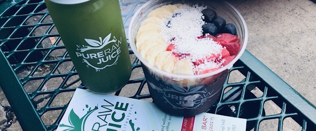PURE RAW is on a mission is to make healthy eating a habit everyone can adopt! Their motto is fueling healthy lifestyles and positive energy hugs you when you walk through the door of PURE RAW. I opt for an acai bowl with banana and apple juice topped with granola, strawberry, blueberry, and coconut.